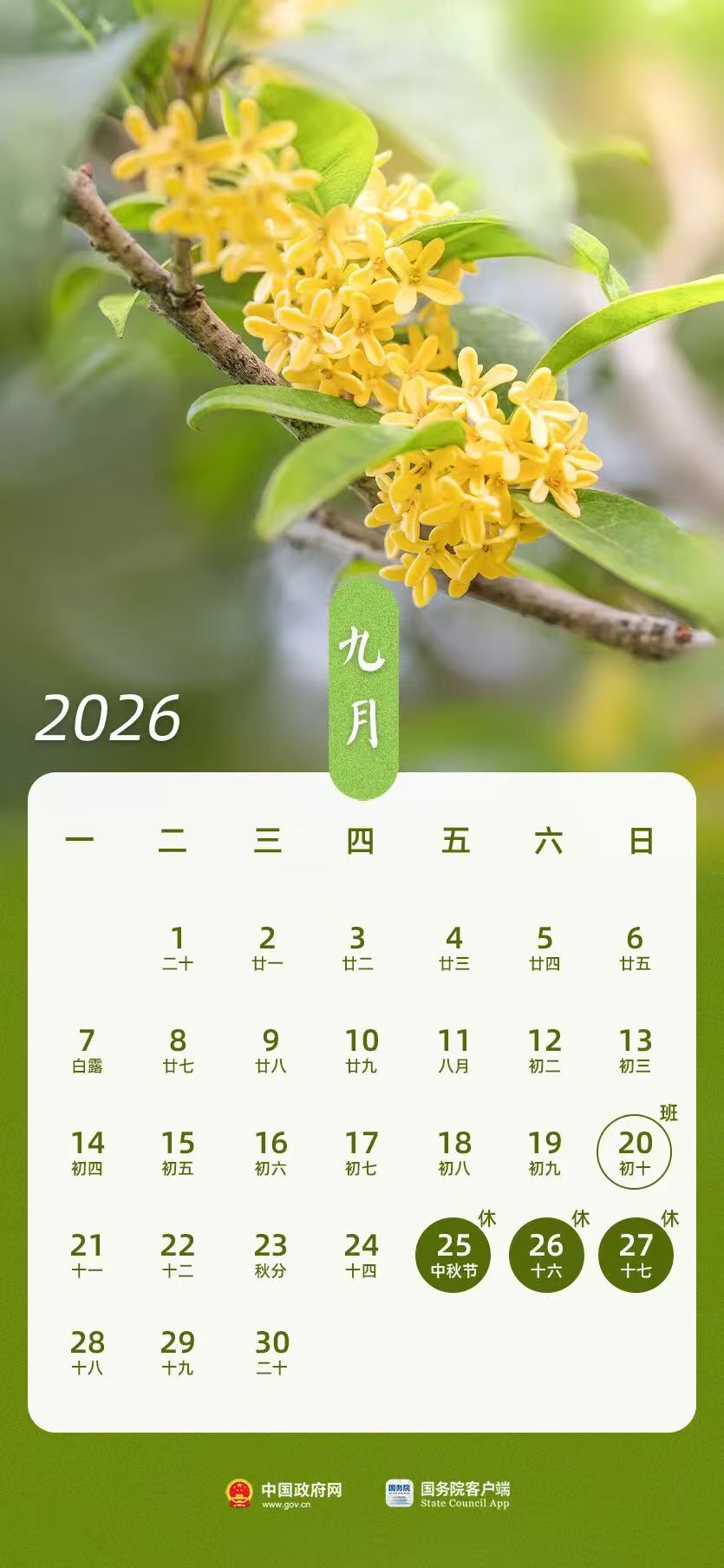 ཟླ11པའི་ཚེས4ཉིན། རྒྱལ་སྲིད་སྤྱི་ཁྱབ་ཁང་གཞུང་སྒྲུང་ཐིང་གིས2026ལོའི་དུས་ཆེན་དང་གུང་གསེང་ཉིན་མོ་ཁག་ཅིག་བཀོད་སྒྲིག་ཐད་ཀྱི་བརྡ་ཐོ་འགྲེམ་སྤེལ་བྱས། བརྡ་ཐོ་ལྟར་ན། ལུགས་གསར་ལོ་སར་ཟླ1པའི་ཚེས1ནས་ཚེས3བར་ཁྱོན་ཉིན3ལ་གུང་གསེང་གཏང་རྒྱུ། རྒྱ་ལོའི་ལོ་སར་ཟླ2པའི་ཚེས15ནས་ཚེས23བར་ཁྱོན་ཉིན9ལ་གུང་གསེང་གཏང་རྒྱུ། ངལ་རྩོལ་དུས་ཆེན་ཟླ5པའི་ཚེས1ནས་ཚེས5བར་ཁྱོན་ཉིན5ལ་གུང་གསེང་གཏང་རྒྱུ་ཡིན་ནོ། །